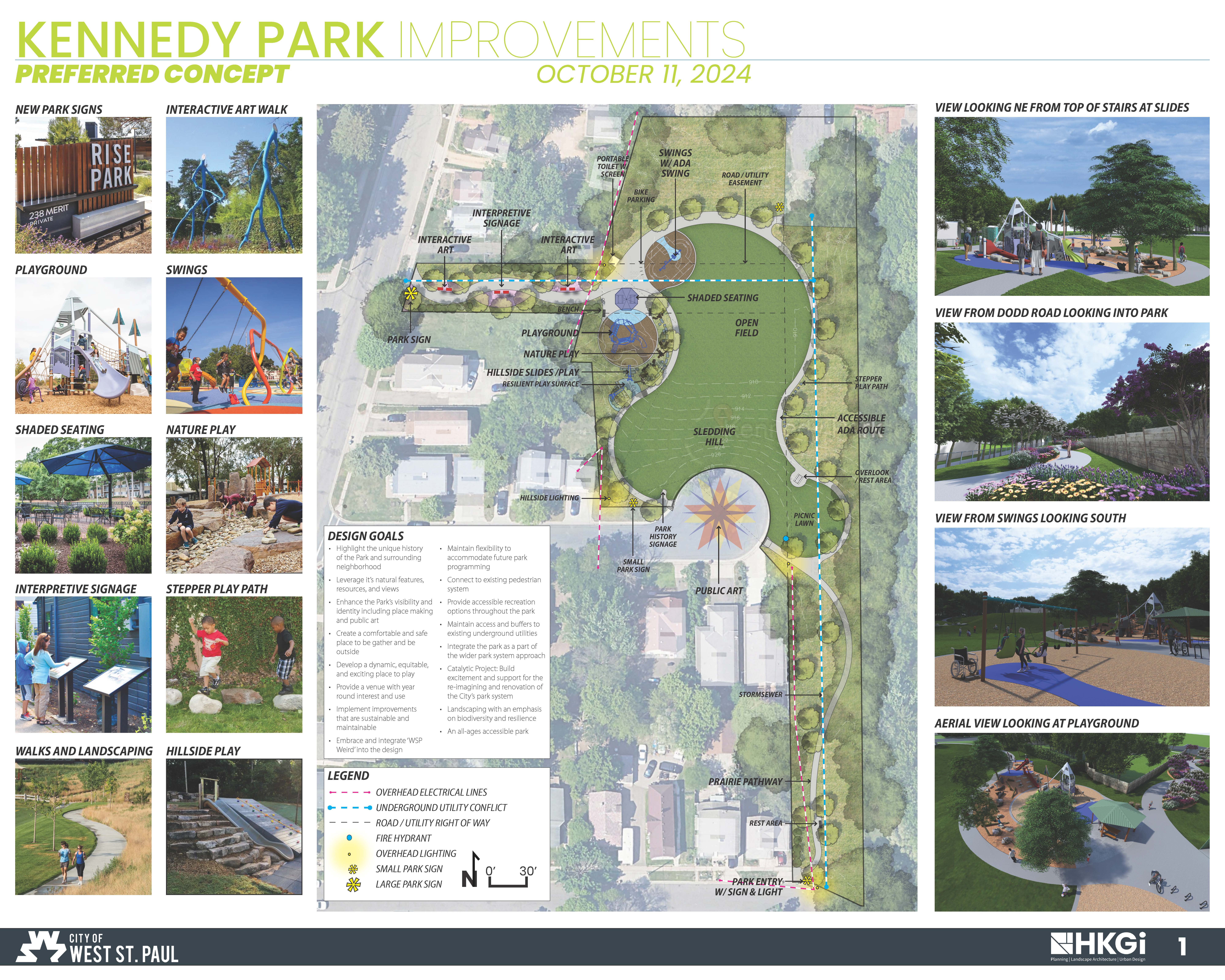 The park system plan is the city's blueprint for future park improvements. The draft plan calls for unique amenities, more community gathering spaces, better incorporation of arts and nature, and park designs that offer something for everyone. To learn more about the draft park system plan, visit https://wspmn.gov/986/Parks-System-Plan. The draft system plan calls for a nature-themed playground, hillside sledding, gathering space, and better biking and walking access at Kennedy Park.
